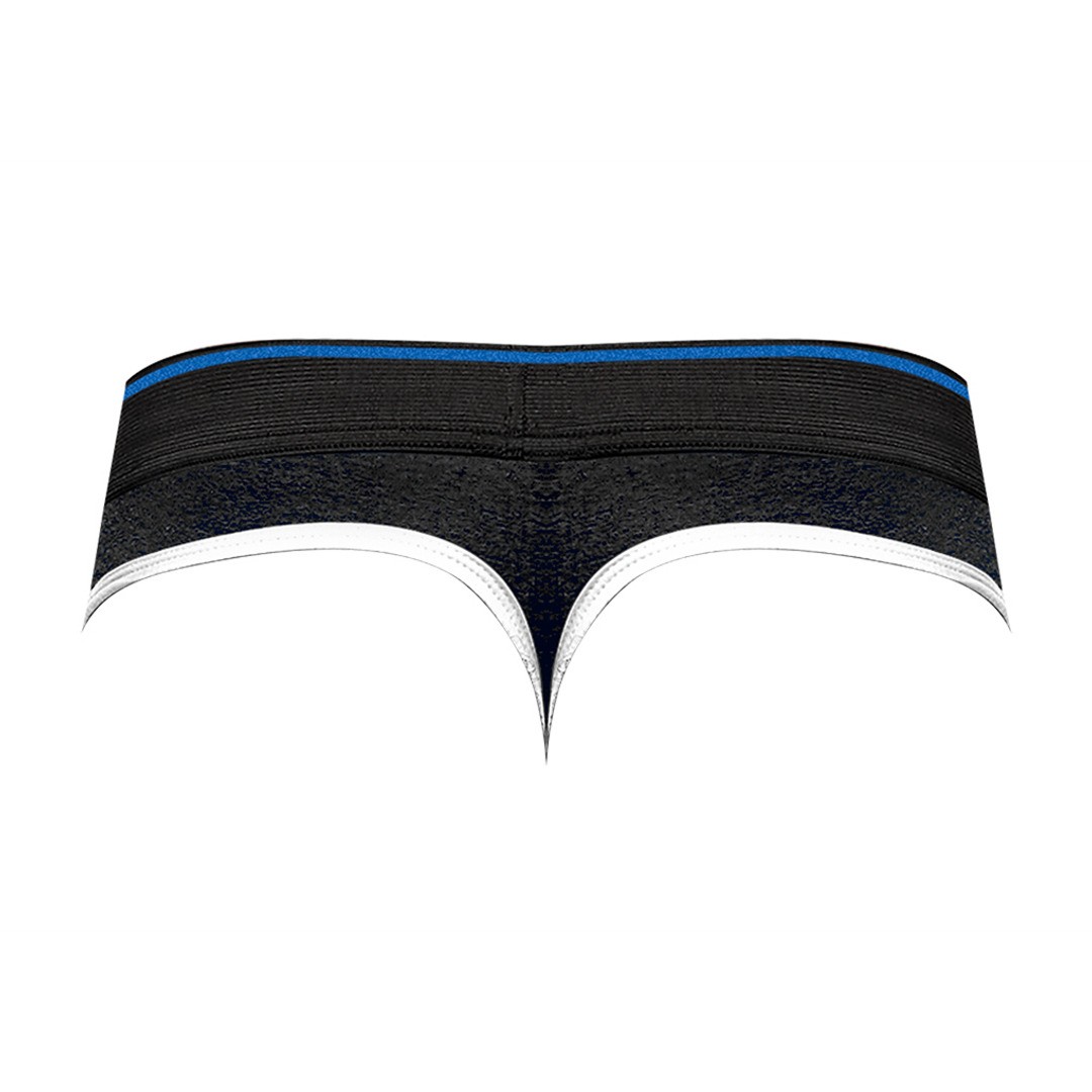 From Male Power's Retro Sport collection, this model features a thong with contrasting colour fabric panels and inserts, full front coverage enhanced by stripes and white trim, and a plush elastic waistband with the MP logo. It provides a comfortable fit, is made from high-quality materials and enhances the contours of the body.