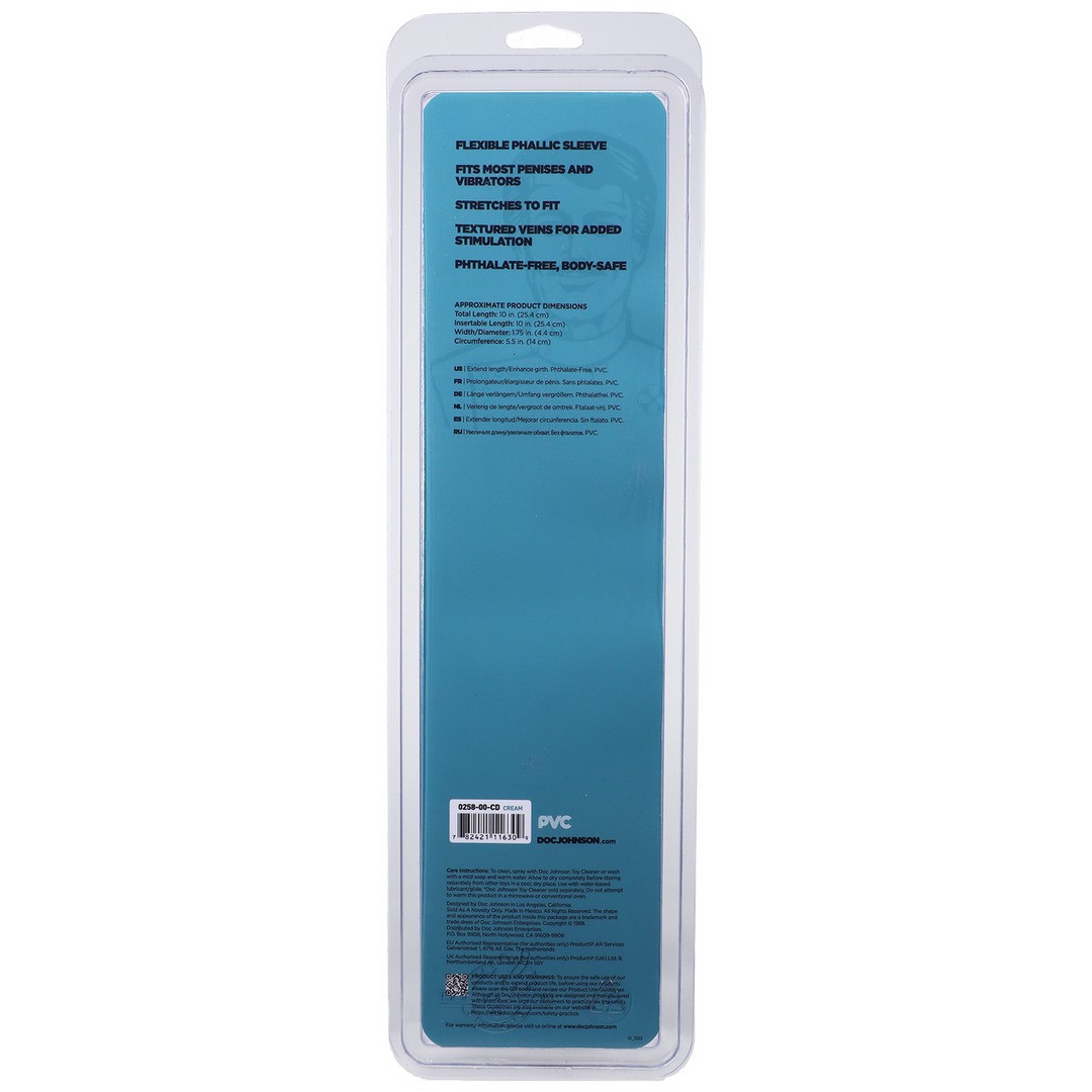This hollow sleeve slides easily over an erect or semi-erect penis, creating a vacuum effect that ensures it does not slip during use. It features textured veins for additional stimulation and is made from body-safe, phthalate-free PVC.