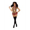 Schoolgirl-inspired fishnet teddy set with plastic glasses. Features a halter neck with tartan fabric bow and Velcro fastening at the back. The plunging neckline has an adjustable bow fastening and checkered detail with a mini skirt effect. Open crotch, thong back and fixed, adjustable suspenders. Suspender stockings and hair bows not included.