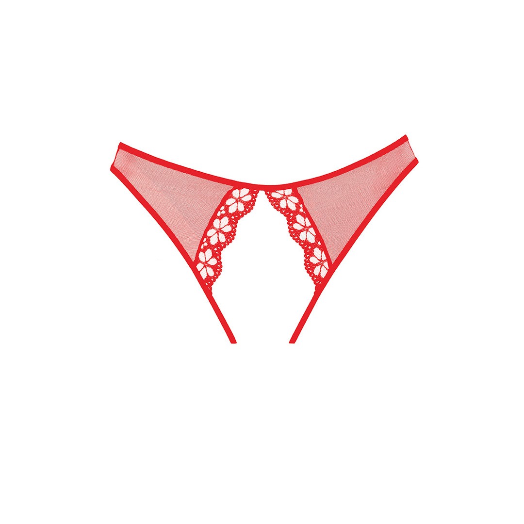 A mix of sheer mesh and flower lace with picot trim, makes this panty with peekaboo cut outs in front and back, deliciously naughty.