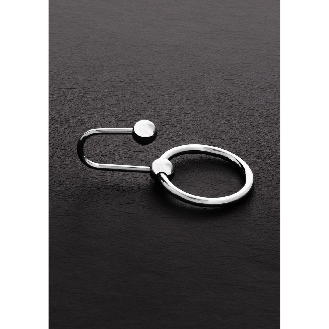 Steel urethral plug with 2.5 cm ring and articulated hook for intense urethral stimulation.