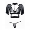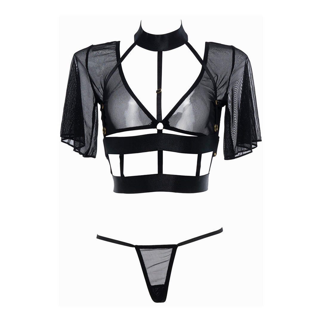 Unabashed design of teasing pleasing, offers minimal coverage with maximum results. The sheer mesh top is fused with edgy thick strapping to make this a shockingly sexy yet whimsical piece. Adjustable back hook opening. Comes with a sheer mesh thong.