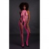 Neon UV bodystocking with halterneck neckline and open crotch, in neon pink or green, for a daring look that lights up the night.