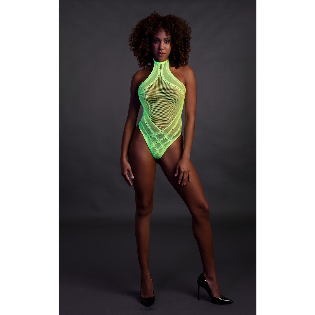 Neon UV teddy with halterneck neckline — sensual, stretchy and made to shine when the lights go down.