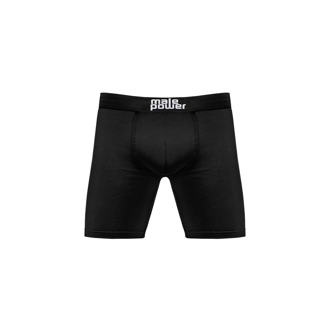 From Male Power's Black Nite collection, this model includes long compression shorts with a reinforced support pouch, ultra-stylish branded waistband and above-the-knee length. Made from lightweight, airy and breathable micro-mesh, it is ideal for both home and gym wear. Ultra-lightweight fabric with exceptional elasticity. Elasticated plush waistband with brand logo.
