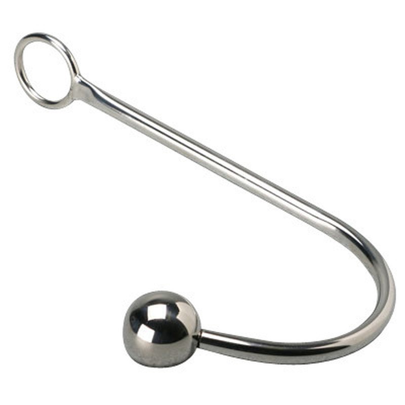 The stainless steel anal hook has a ring for secure attachment in bondage games.