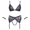 Delicate dark purple lace with matte black details and silver rings and chains. Bra with non-padded cups, adjustable straps and an adjustable hook fastening at the back. The suspender belt also has a hook at the back and adjustable suspender straps. A removable, stimulating chain runs over the open crotch. The hook chain ties can be attached to the rings on either side of the high waist. The soft bindings are easy to put on and take off thanks to the adjustable hook and loop fasteners.
