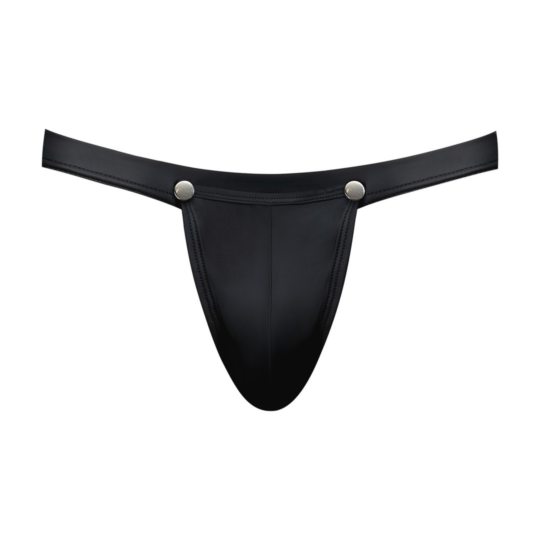 Men's jockstrap with detachable pouch and bold design in matte black spandex for maximum daring and impact.