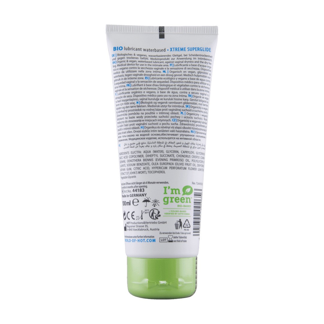 HOT™ BIO Superglide Extreme es un lubricante suave a base de agua que permanece suave durante mucho tiempo. Es seguro usarlo en combinación con condones y juguetes sexuales. HOT™ BIO Superglide Extreme es un lubricante completamente natural en un tubo ecológico.