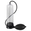 Bomba de pene transparente con funda negra (2 cm, flexibles) y práctica pera de bombeo. La escala graduada permite seguir visualmente el aumento conseguido. Incluye válvula de seguridad para controlar la presión.