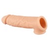 Funda suave y aterciopelada, con glande pronunciado y venas realistas. Ayuda a prolongar la resistencia masculina y aumenta el pene en unos 5 cm. El orificio adicional para los testículos ofrece mayor sujeción y una sensación agradable, firme y cómoda durante su uso.