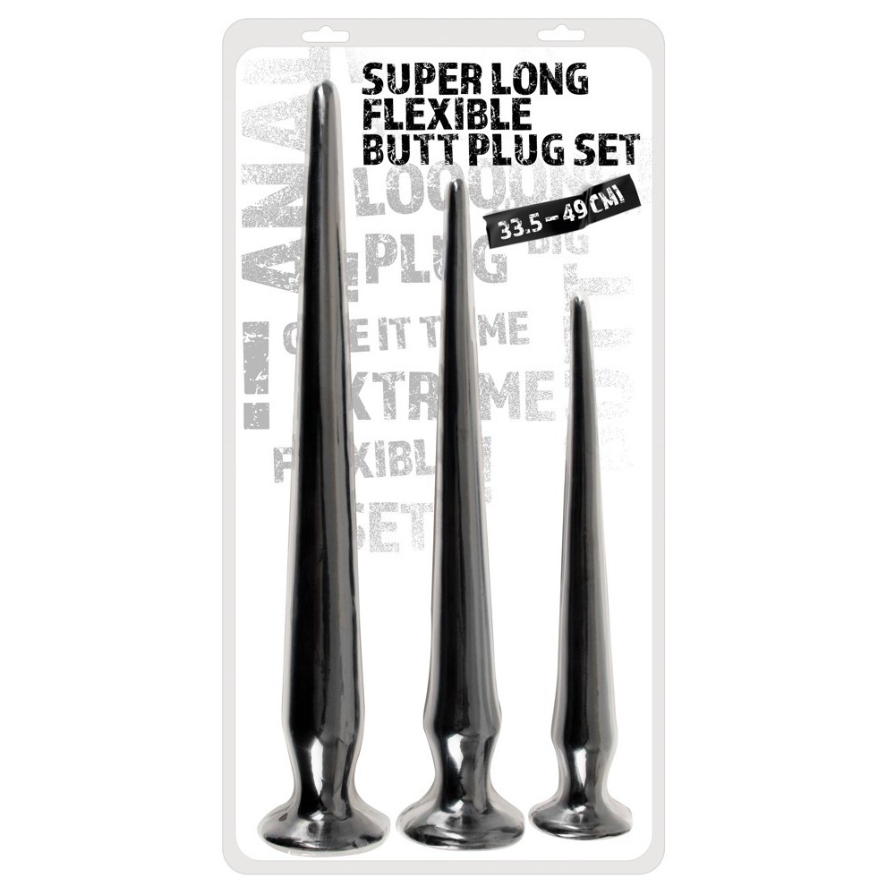 Super Long Flexible Butt Plug Set de You2Toys: conjunto con 3 plugs anales muy largos, de diferentes tamaños y pesos. Cada plug es extremadamente flexible y presenta una punta suave en forma de cono y una ventosa que funciona como tapón.
