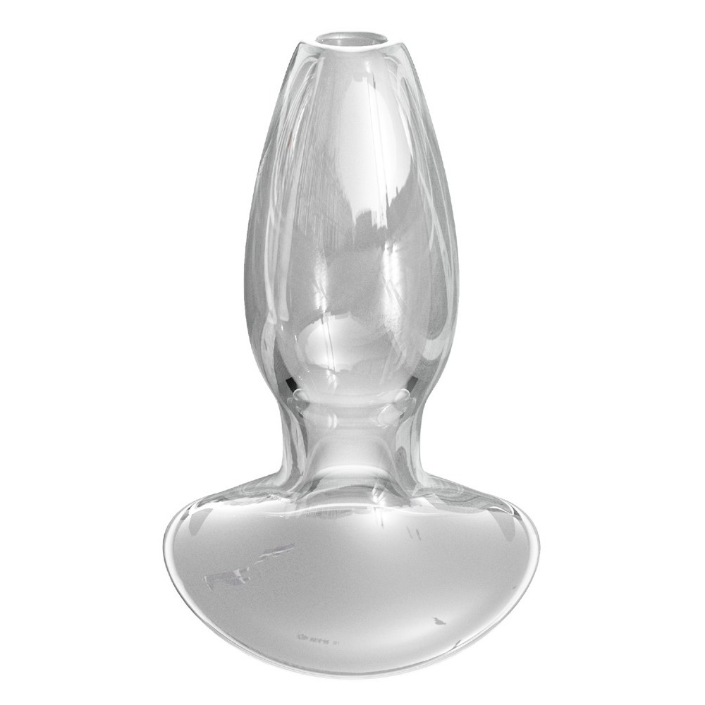 Plug anal hueco con base de seguridad que impide una inserción excesiva. Perfecto para enemas refrescantes y juegos sensoriales con un mini vibrador. Presenta un diseño exclusivo y transparente en vidrio borosilicato, resistente e higiénico.