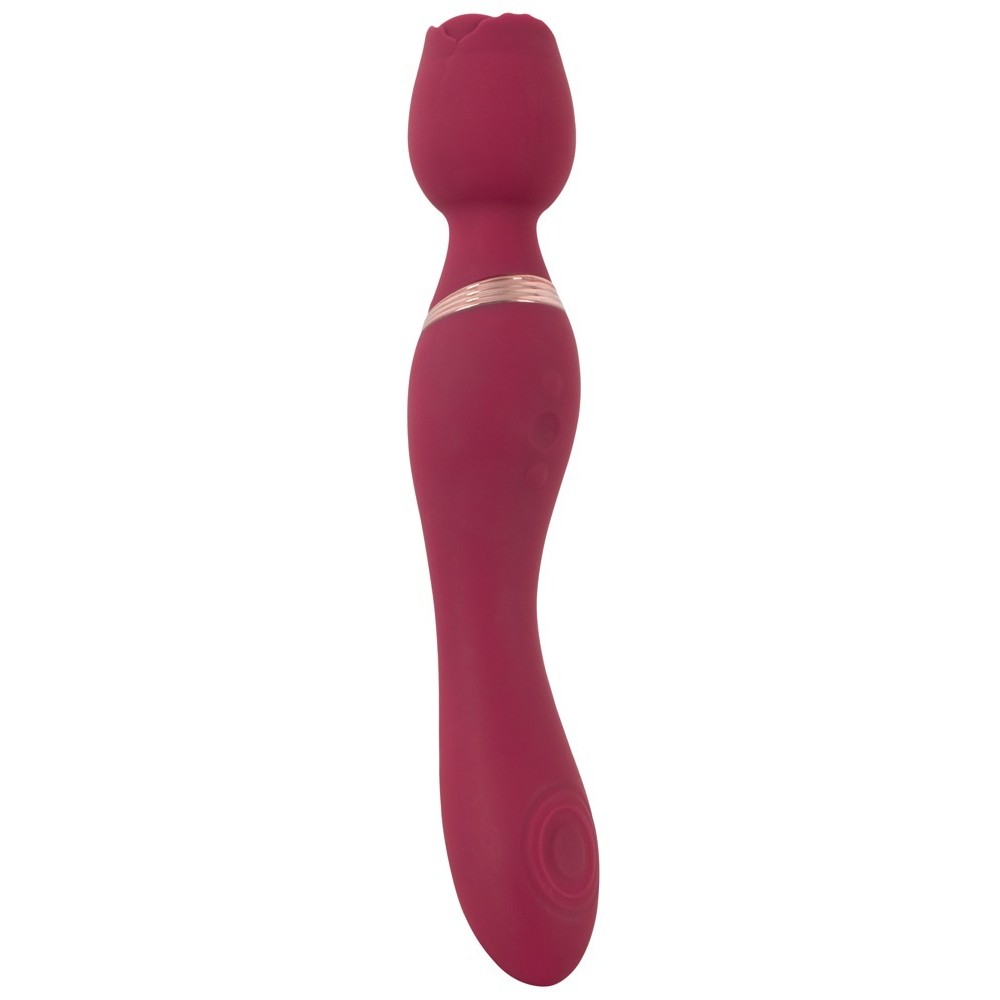 La elegante varita de masaje Thumping Wand Vibrator de Rosenrot presenta una rosa cerrada como cabezal de masaje. Se pueden utilizar ambos extremos, ya que cada uno está equipado con un potente motor: el cabezal en forma de rosa como masajeador y el eje como vibrador.
