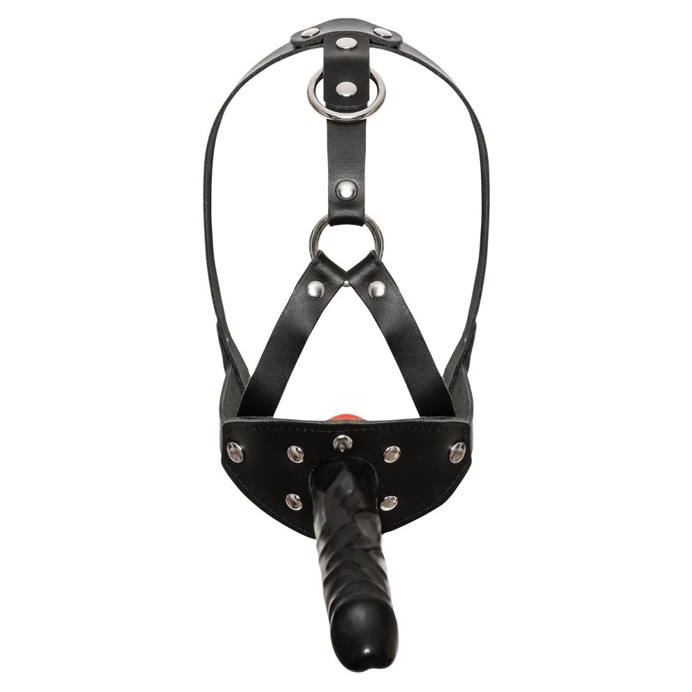 Este arnés ajustable para la cabeza en color negro incluye una mordaza roja en el interior, con un diámetro de 3,5 cm, y un consolador grande firmemente fijado en el exterior. El dildo mide 13 cm de largo y tiene un diámetro de 3,5 cm, lo que ofrece una experiencia intensa y controlada.