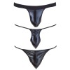 Siempre es bueno tener estas tres tangas en el cajón de la ropa interior: una tanga mini, un tanga G-string mini y un jockstrap. Todos están confeccionados en tejido elástico negro, con un acabado brillante y efecto mojado.