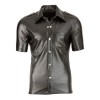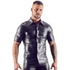 Camisa de hombre en imitación de piel negra brillante, ligeramente entallada en la cintura para resaltar los músculos. Detalles como la fila de botones a presión, las presillas y el bolsillo en el pecho le dan un toque elegante y seguro. Ideal para combinar con vaqueros o para un look más atrevido.