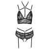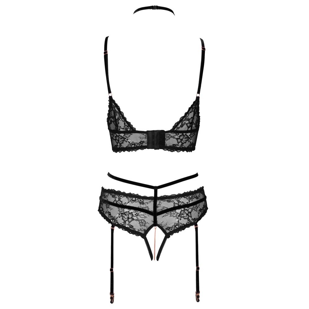 Conjunto compuesto por sujetador y tanga con ligas, sin entrepierna, de Abierta Fina. El delicado encaje y el terciopelo extremadamente suave se combinan en un diseño excitante, enriquecido con elementos metálicos en tono rosa dorado y brillantes anillos de strass. El sujetador presenta aberturas en las copas, tiras de terciopelo en la zona del escote y cierre de gancho en la espalda. El tanga con ligas, sin entrepierna, incluye una estimulante cadena extraíble sobre la zona de la entrepierna. Las tiras elásticas, las tiras de las ligas y las tiras del escote son de terciopelo y ajustables para un ajuste perfecto; las tiras de las ligas también son extraíbles.
