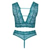 Sujetador y tanga sin entrepierna de Cottelli CURVES en un conjunto irresistible, totalmente confeccionado en suave y delicada encaje en tono azul petróleo. El sujetador presenta un escote profundo por delante y por detrás, y está unido por tiras elásticas y elegantes anillas decorativas en oro rosa. El tanga de cintura alta, sin entrepierna, destaca por su atrevido escote delantero, sujeto únicamente por anillas y tiras elásticas.