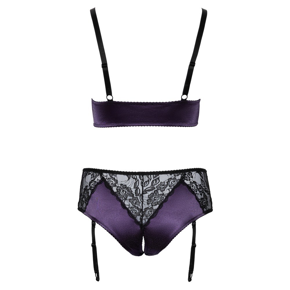 El sujetador y el tanga con liguero, sin entrepierna, de Cottelli CURVES están confeccionados en una elegante combinación de satén morado y delicado encaje negro. El sujetador destaca por las tiras elásticas cruzadas sobre el escote, mientras que el tanga de cintura alta destaca por su atrevido diseño abierto en la zona de la entrepierna. Los tirantes anchos y elásticos del sujetador son ajustables para un ajuste perfecto. Las tiras de liguero del tanga también son ajustables y extraíbles.