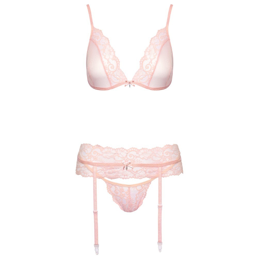Conjunto de Kissable compuesto por un sujetador suave, un liguero y un tanga, confeccionado en tul fino y encaje delicado. Suave y elástico en todo su contorno para una máxima comodidad al llevarlo puesto. El sujetador cuenta con tirantes ajustables y cierre de corchete en la espalda. El liguero también cuenta con cierre de corchete en la parte trasera y tiras ajustables. El tanga, de diseño delicado y atrevido, destaca por sus dos tiras finas y elásticas que se unen en la parte delantera.