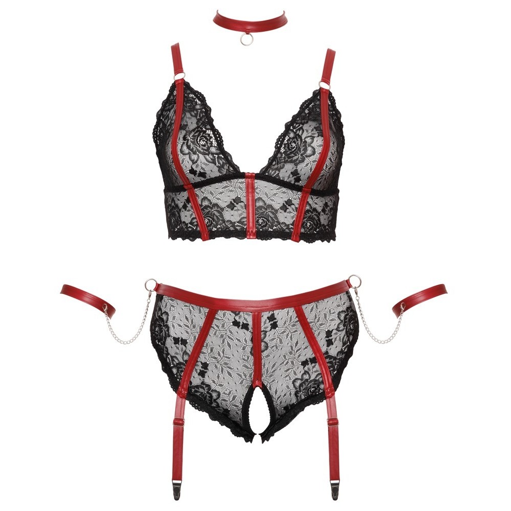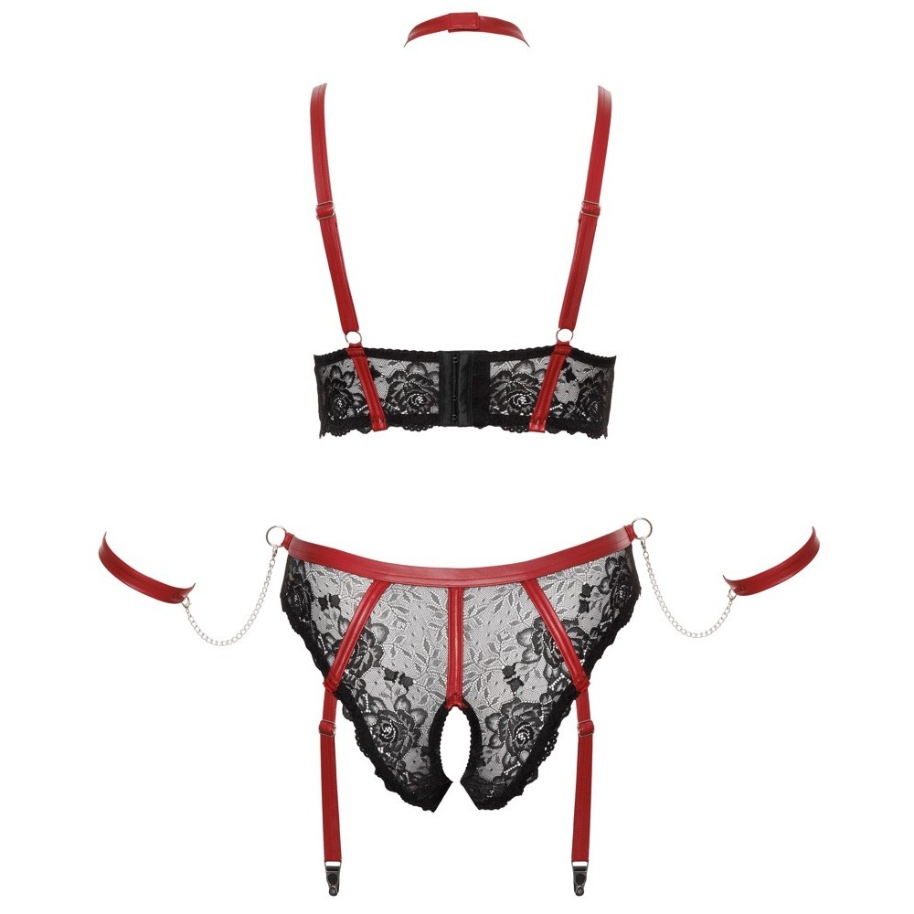 Conjunto BONDAGE PLUS de Cottelli compuesto por un sujetador con escote alargado, tanga con tiras de liguero y abertura en la entrepierna, collar y dos esposas para los brazos. El delicado encaje negro elástico está decorado con detalles en contraste en rojo mate y accesorios plateados. El sujetador cuenta con copas suaves y cierre de corchete ajustable en la parte trasera, así como tirantes ajustables para un ajuste cómodo. Las tiras de liguero del tanga también son ajustables. El tanga presenta una entrepierna abierta y una anilla lateral en la cintura donde se pueden fijar fácilmente las esposas incluidas mediante corchetes de presión. Las esposas suaves son ajustables con cierres de corchete y anilla. El cuello estrecho, con anilla frontal y cierre ajustable de corchete y anilla, completa este look atrevido y seductor.