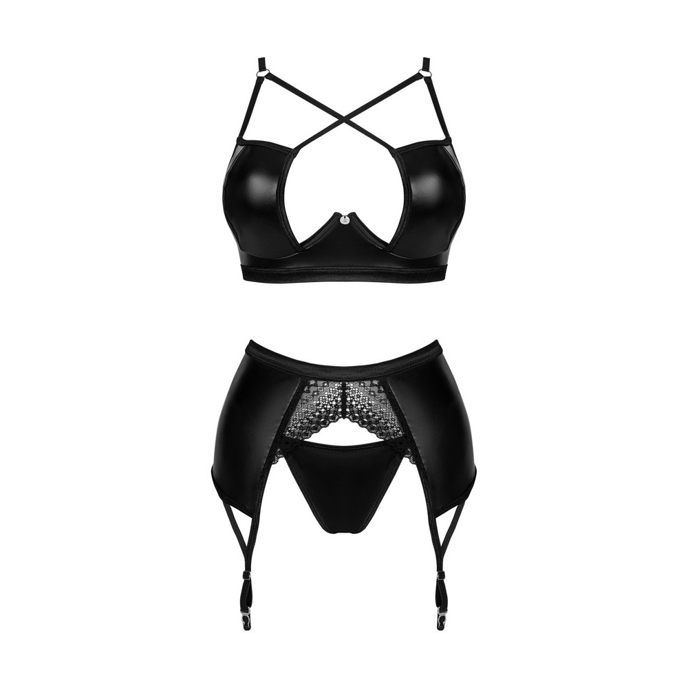 Conjunto de tres piezas Norides, de Obsessive, compuesto por sujetador con aros, liguero y tanga, en tejido con efecto mojado, elástico y suave. El sujetador presenta un corte sofisticado, con un escote extravagante y tirantes ajustables, así como un cierre de gancho en la espalda para un ajuste perfecto. El liguero incluye una inserción de encaje en la parte delantera y un cierre de gancho en la parte trasera, con tiras ajustables. El tanga con efecto mojado seduce con un delicado triángulo de encaje en la parte trasera.