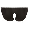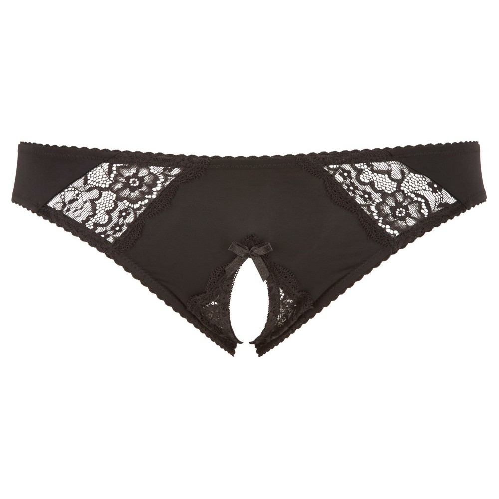 Braguitas ajustadas con inserciones de encaje elástico en la parte delantera. La zona de la entrepierna está provocativamente abierta y el diseño se realza con un atrevido lazo decorativo que añade un toque irresistible.