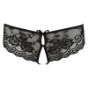 Este encantador tanga combina un delicado encaje con estampado floral con aberturas delanteras y traseras decoradas con pequeños lazos. La entrepierna, seductoramente abierta, está cubierta solo por dos tiras elásticas. Gracias al alto porcentaje de spandex, el tanga es extremadamente cómodo y se adapta a las curvas femeninas.