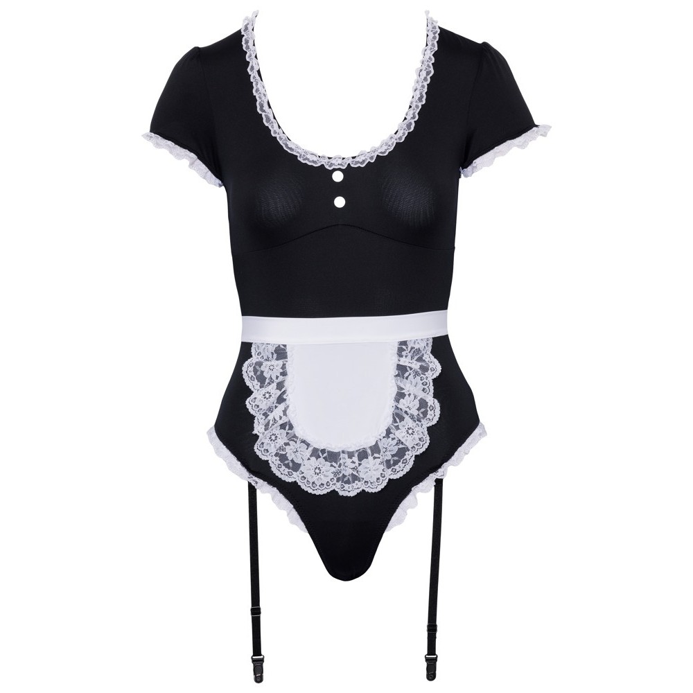 Este disfraz de criada de Cottelli COSTUMES incluye un body con ligas y un delantal a juego. El body negro, suave y elástico, destaca por los elegantes volantes de encaje blanco alrededor del generoso escote, en las mangas cortas y en las aberturas de las piernas. Dos pequeños botones blancos decorativos en la parte delantera completan el clásico look de sirvienta. La entrepierna cuenta con prácticos cierres. Las ligas son ajustables y totalmente extraíbles. El delantal blanco, con volantes de encaje, se ata en la espalda para un ajuste perfecto.