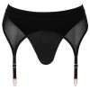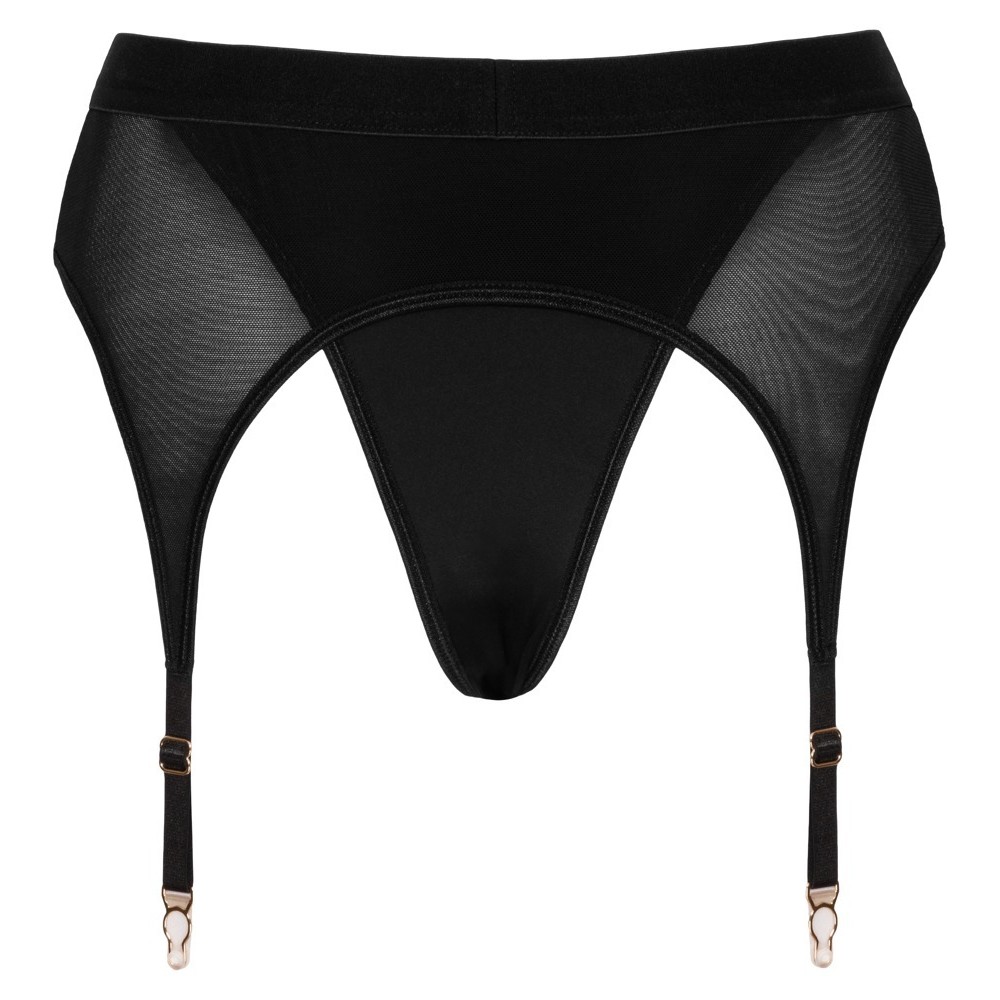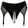 Tanga strap-on negra con ligas de Bad Kitty, confeccionada en microfibra suave combinada con un liguero de powernet suave. La parte delantera de doble capa incluye una abertura con un anillo elástico integrado (Ø 3,5 cm), ideal para acoplar accesorios con base de succión. Las ligas son ajustables, lo que garantiza un ajuste perfecto y una mayor versatilidad.