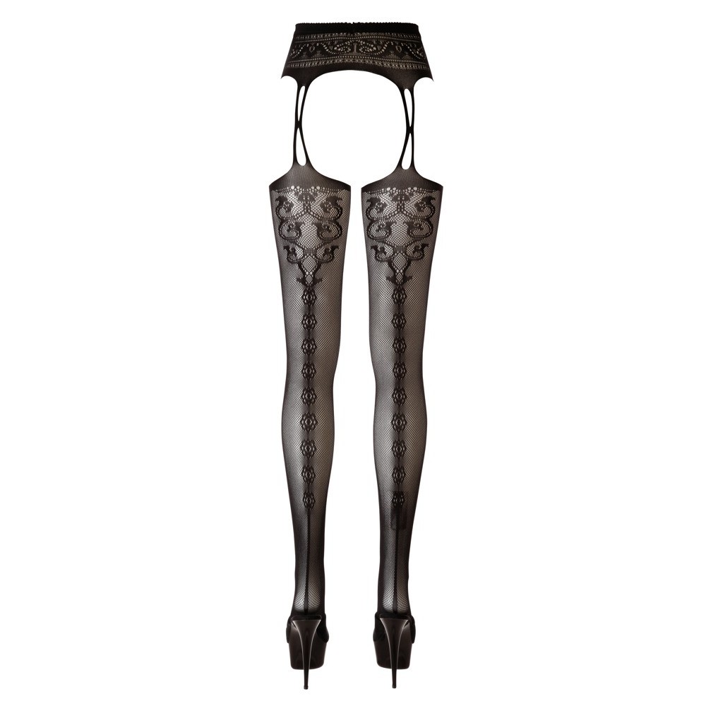 Medias con efecto liguero extravagante que se abren de forma sugerente en la zona de la entrepierna. Con un excitante aspecto de liguero. Las medias están confeccionadas con un delicado tejido de rejilla. El patrón de costura integrado en la parte trasera completa este look sexy.