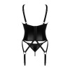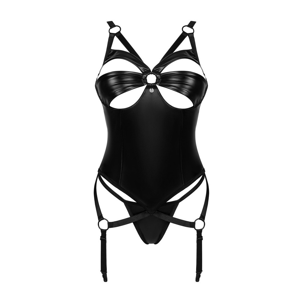 El conjunto Armares de Obsessive incluye un corpiño con liguero y tanga de ajuste perfecto, en un estilo mojado moderno, elástico y suave. Las copas con aros presentan seductores recortes y pequeños elementos de joyería. Los tirantes y las tiras de liguero con anillas inteligentes son totalmente ajustables, al igual que el cierre de gancho en la espalda.
