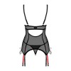El conjunto Glandez de Obsessive combina un corsé y un tanga con ligas en fina transparencia negra, suave y elástica para una comodidad perfecta. El corsé presenta un cuello medio rojo a contraste, un anillo decorativo y un pequeño adorno entre las copas con aros. Los cordones ajustables en los laterales, los tirantes, el cierre de gancho y las ocho tiras de liguero permiten un ajuste totalmente personalizado, mientras que las cuatro tiras rojas contrastantes de los tirantes son extraíbles.