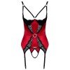 Conjunto de corpiño sin copas y tanga sin entrepierna de Cottelli LINGERIE. Confeccionado en satén rojo elástico y adornado con delicado encaje y elementos contrastantes en negro. Súper suave y elástico, garantizando una gran comodidad al llevarlo puesto. El sujetador balconette integrado está acolchado y realza los senos, que quedan perfectamente enmarcados y sujetos por los tirantes y los aros de las copas. Anillas de strass brillantes entre las copas y en la parte delantera de la cintura completan el conjunto. Los tirantes y las tiras de liguero son muy elásticos y ajustables para un ajuste perfecto. La parte trasera de la camiseta tiene una fila de cierres de gancho y el tanga a juego presenta una provocativa abertura en la zona de la entrepierna.