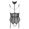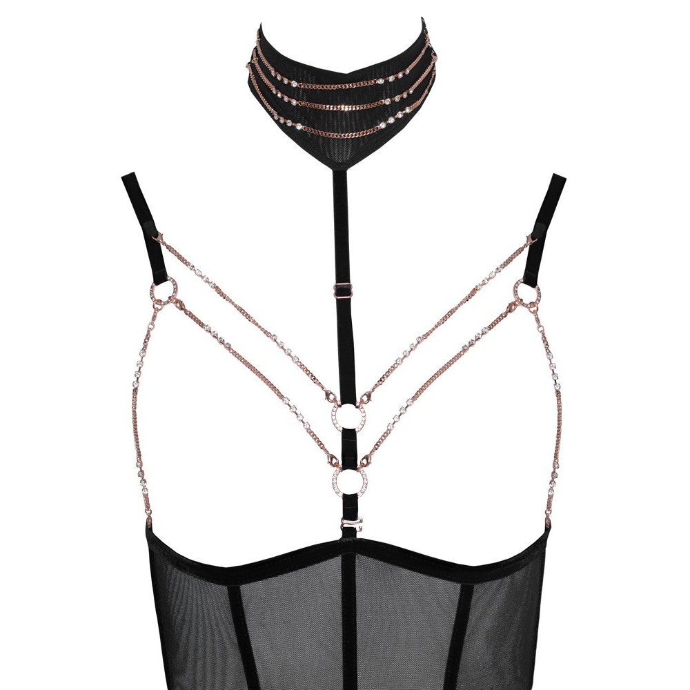 Body abierto de Abierta Fina, confeccionado en tejido powernet, con la zona de la entrepierna completamente abierta, tirantes elásticos de terciopelo y detalles en tono oro rosa. Los tirantes del sujetador y de las ligas son ajustables, y las tiras de las ligas también se pueden quitar. Incluye una tira de escote ajustable y una gargantilla con botón en la parte trasera y cadenas decorativas, ambas desmontables. Las pequeñas cadenas de la zona del escote, con cierres a presión, y la cadena de la zona de la entrepierna con anilla decorativa también son extraíbles. La parte trasera presenta un efecto de dos piezas, con dos cierres de resorte en el sujetador y una cinta tipo cinturón en la zona de la cintura.