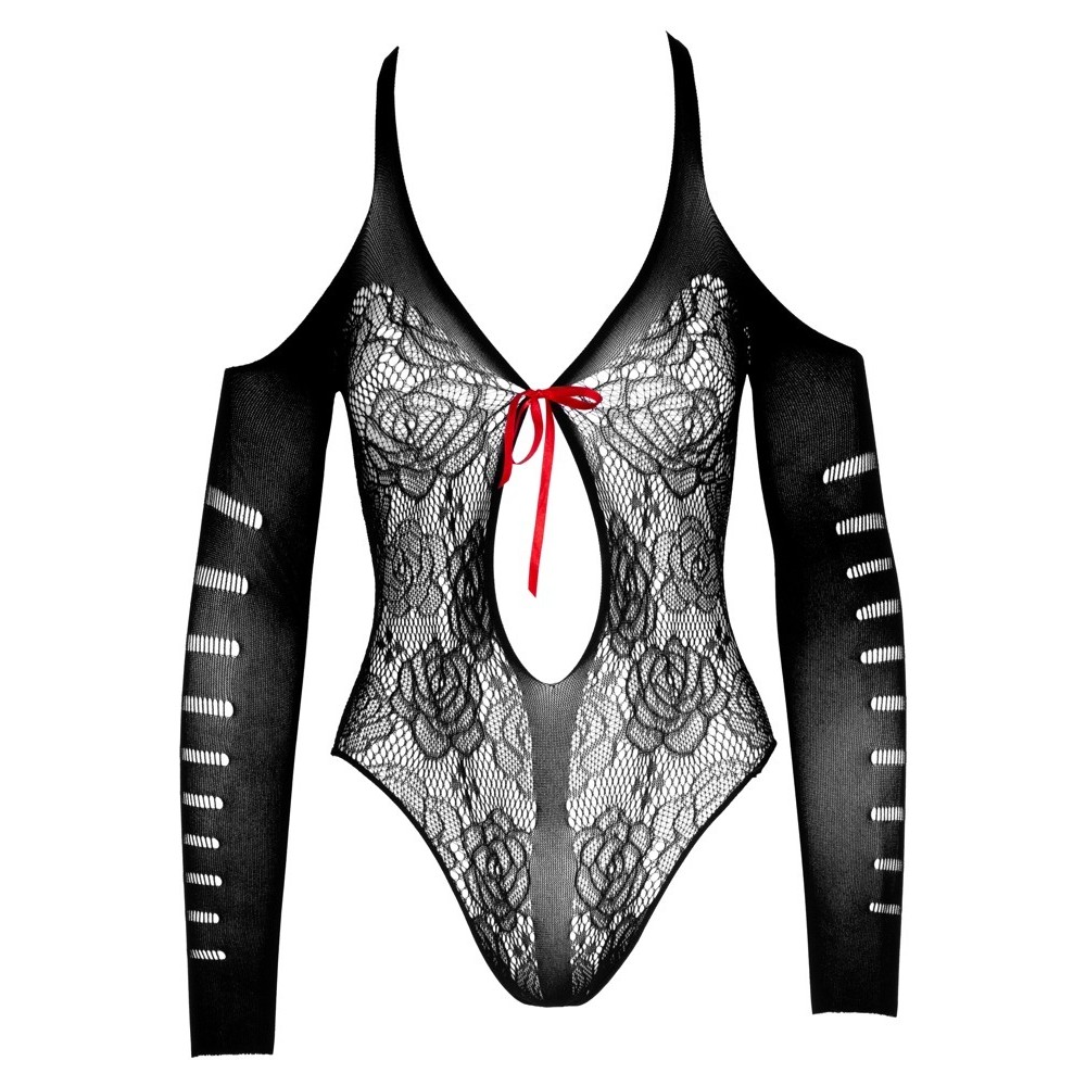 Body sin piernas extremadamente suave de NO:XQSE, con un seductor diseño de encaje. Cuenta con mangas largas y aberturas en los hombros, lo que crea un look atrevido y elegante. Muy escotado por delante, se sujeta con un único lazo rojo, fácil de desatar, que le aporta un toque provocativo. Los sensuales cortes se extienden desde la nuca hasta la parte baja de la espalda, realzando las curvas del cuerpo. Sin costuras y muy elástico, garantiza una comodidad excepcional al llevarlo puesto.