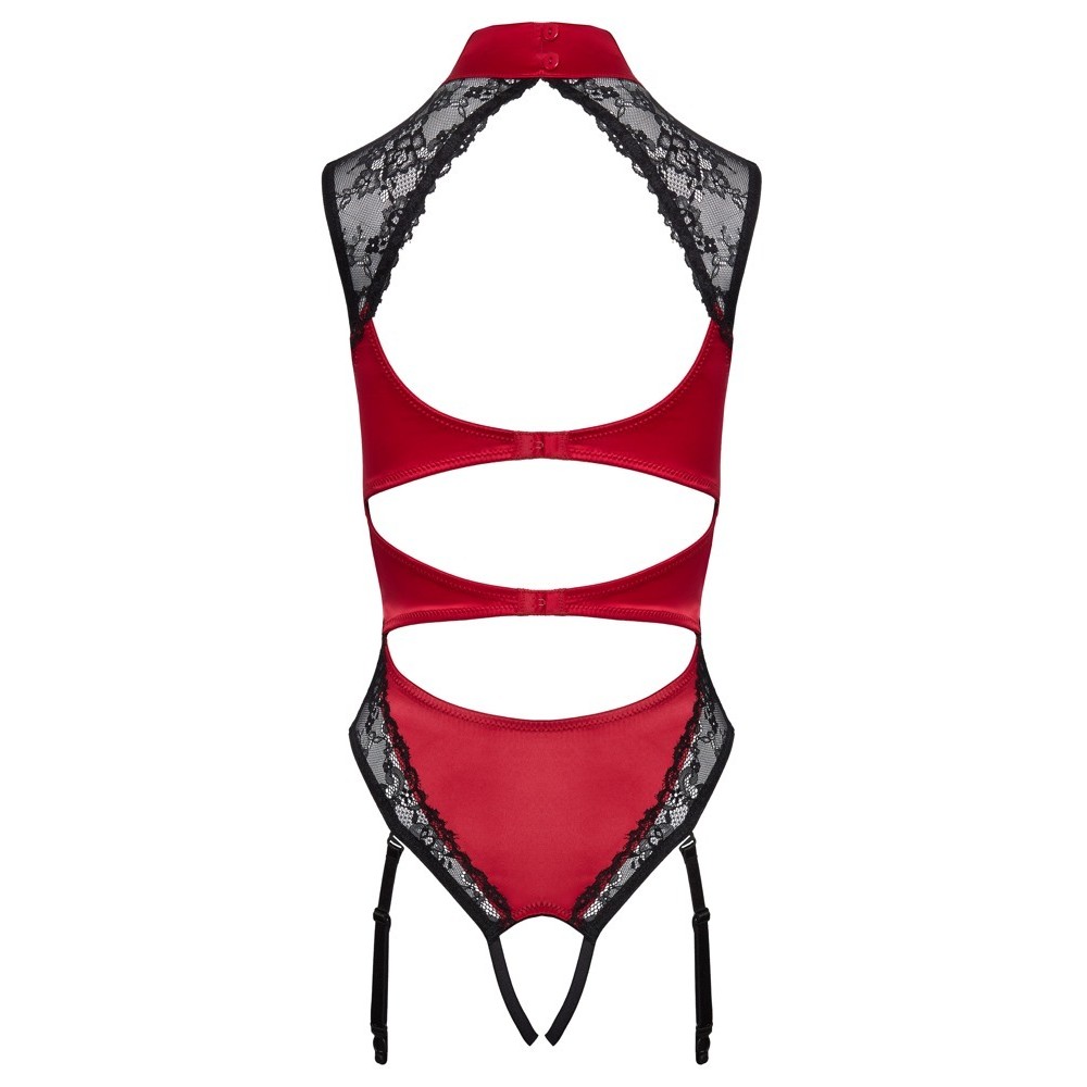 Sensacional body con tirantes de Cottelli LINGERIE, en sofisticado satén rojo con inserciones de fino encaje negro. Suave y elástico en todo el cuerpo para una máxima comodidad. Corte refinado con cuello abotonado de satén, encaje que cubre los hombros y escote revelador. Dos cierres de gancho ajustables en la espalda casi abierta. Dos tiras elásticas cruzan la entrepierna abierta. Las tiras de liguero son ajustables y totalmente extraíbles.