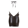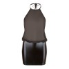 Sensual vestido negro con escote halterneck que se ata en la espalda, cuello alto y espalda completamente descubierta. La falda brillante con efecto wet look se ajusta al cuerpo, mientras que la parte superior de gasa transparente suelta crea un contraste elegante y provocativo.