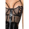 Vestido con corpiño semitransparente a rayas, varillas moldeadoras, tirantes ajustables de vinilo y tiras decorativas. La falda corta y amplia de vinilo brillante completa el look sexy. Entre los elegantes detalles destacan los bordados en las copas, las rayas decorativas de vinilo y una cremallera completa en la parte delantera, que garantiza un ajuste perfecto y provocativo.
