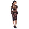Vestido de manga larga de Noir, confeccionado íntegramente en powernet elástico, con un delicado estampado floral en copos de terciopelo. Largo hasta la rodilla, con una abertura de 18 cm en la parte trasera. El cuello alto se abrocha con un pequeño botón sobre un elegante corte ovalado en la espalda.