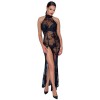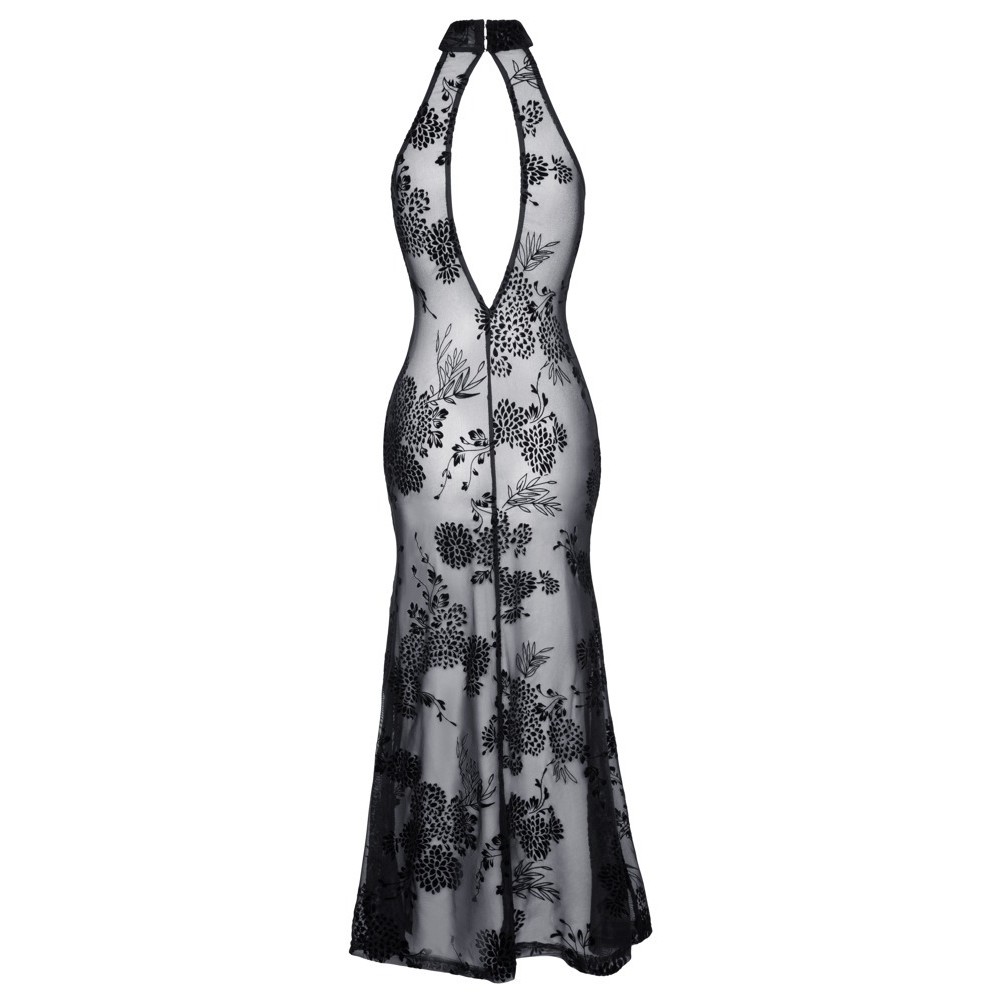 Vestido largo sin mangas de Noir, confeccionado íntegramente en powernet elástico, cubierto por un delicado estampado en terciopelo flocado con motivos florales. El modelo es ajustado, con una abertura alta en la pierna delantera, cuello alto cerrado con un botón en la espalda y un elegante corte ovalado en la espalda.