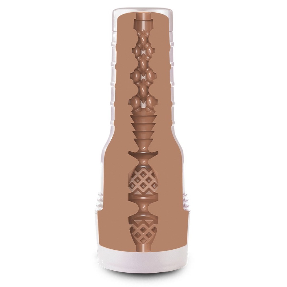 Masturbador con abertura vaginal, presentado en un elegante estuche blanco perla. Incluye una réplica realista de las partes íntimas de la estrella erótica Kazumi. El interior del túnel del placer combina puntos, nervaduras y ranuras de diferentes dimensiones para una estimulación intensa y variada. Con tapa protectora y firma de la estrella junto a la abertura. Textura Superskin para una sensación extremadamente realista.