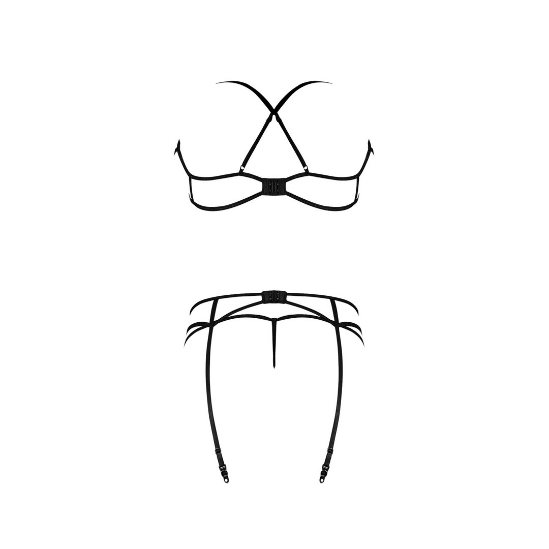 De la colección Exposed by Magic Silk, este conjunto incluye un sujetador de tirantes con tirantes ajustables que se cruzan en la espalda, un anillo decorativo en forma de U en la parte delantera y cierre de corchete en la parte trasera, unas ligas a juego con anillo en forma de U en la parte delantera, cierre de corchete en la parte trasera y ligas ajustables con clips metálicos, y un tanga clásico de malla.