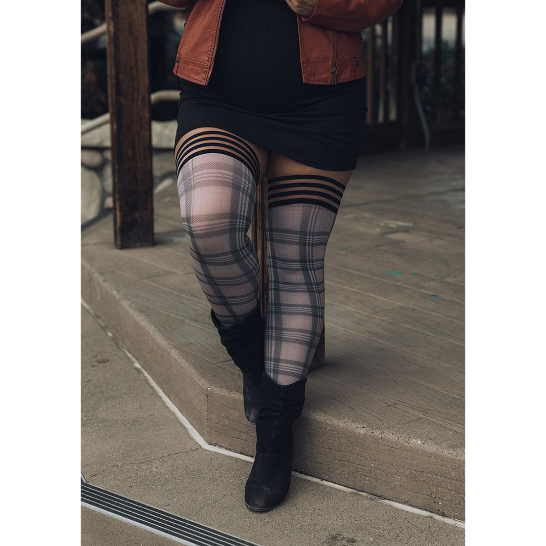 Medias de ligueros Lori a cuadros bronce y negro Kix'ies, elegancia clásica con comodidad y sujeción duraderas.