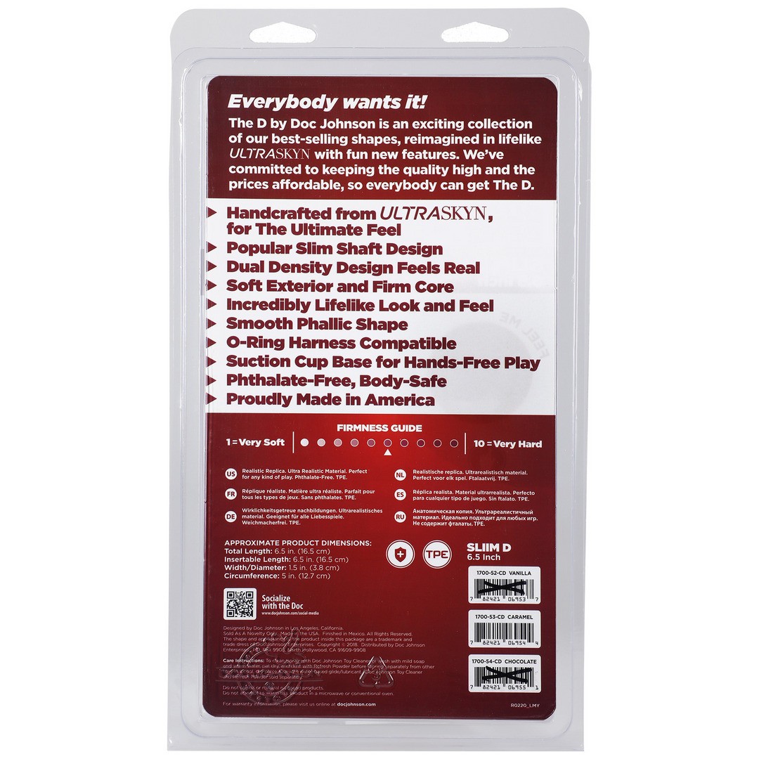 El Slim D, uno de los modelos más populares de Doc Johnson, tiene un ancho cómodo para la mayoría de los cuerpos y está disponible en dos opciones: FIRMSKYN™, para una sensación más firme, y ULTRASKYN™ de doble densidad, que se calienta al tacto, con un exterior suave y un núcleo firme que reproduce la sensación real de un pene.