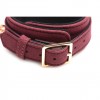 Conjunto de bondage en ante burdeos y dorado, con esposas, collar, correa y cadenas ajustables.