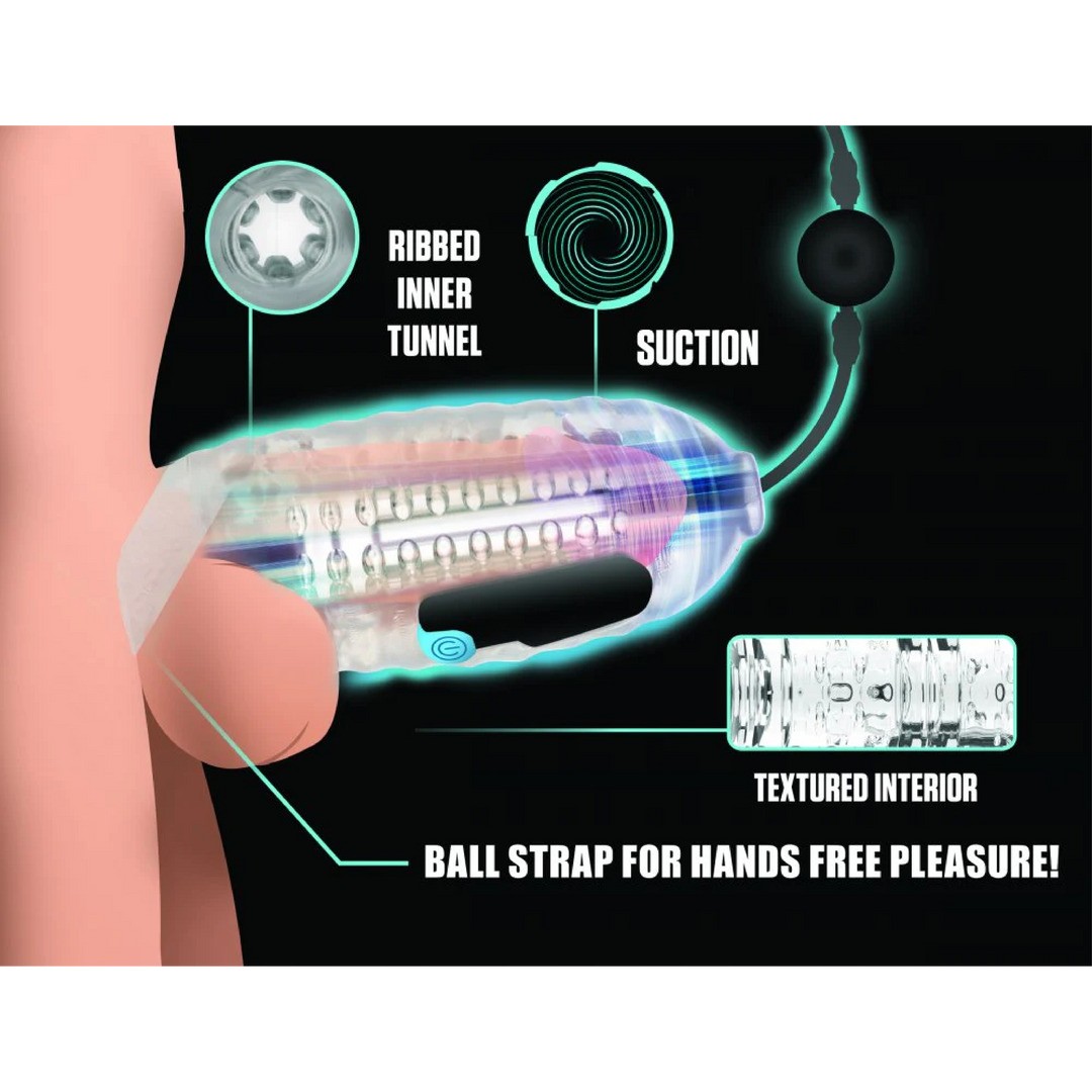 Solo tienes que aplicar un poco de lubricante a base de agua, colocar la funda transparente y elástica de TPE sobre el pene y ajustar la correa de sujeción para los testículos, que la mantiene cómodamente en su sitio. Conecta el tubo a la parte superior de la funda e inserta la bala vibradora en el bolsillo lateral de la misma. A continuación, disfruta de una estimulación completa mediante succión y vibración, controladas por el mini mando portátil.