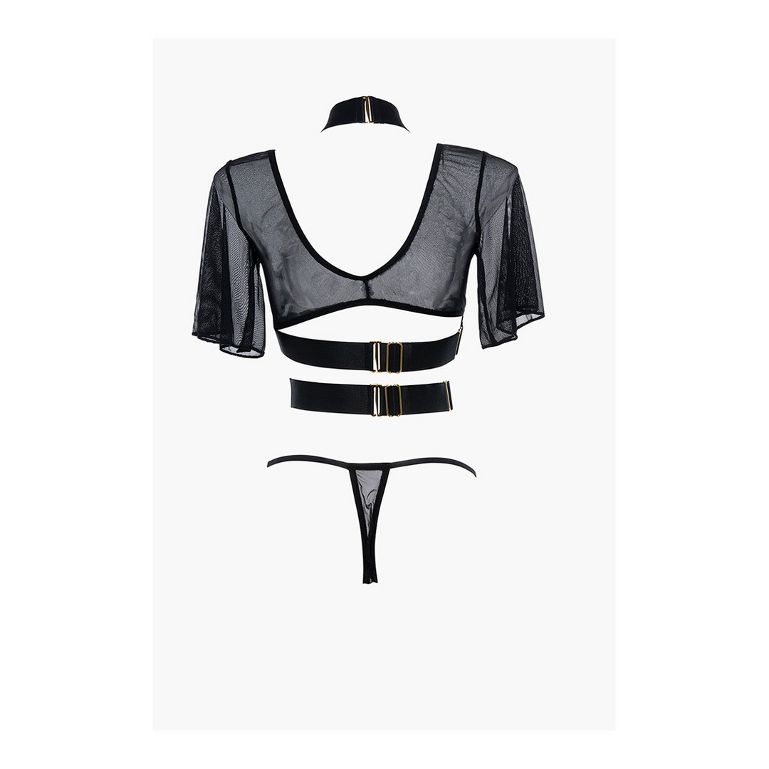 Diseño desenfadado de placer burlón, ofrece una cobertura mínima con resultados máximos. La parte superior de malla transparente se fusiona con tirantes gruesos vanguardistas para hacer de esta una pieza escandalosamente sexy pero caprichosa. Abertura trasera de gancho ajustable. Incluye un tanga de malla transparente.