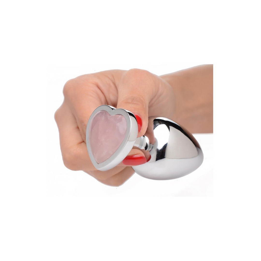 La romántica gema de cuarzo rosa en forma de corazón de la base de este plug anal despierta la energía romántica, fomentando el amor propio y el romance con tu pareja.